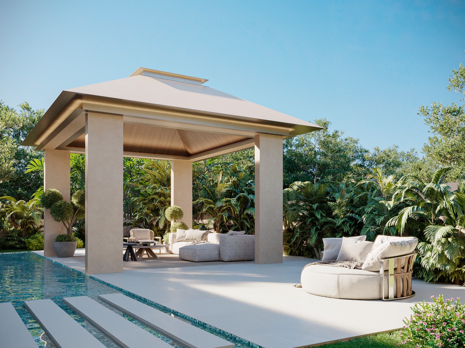 Pozemek o velikosti 1 014 m² nabízí naprosté soukromí a ideální zázemí pro venkovní život. K dispozici je soukromý bazén a rozsáhlé terasy o celkové ploše 296 m², které jsou perfektní pro relaxaci, posezení s přáteli i venkovní stolování.